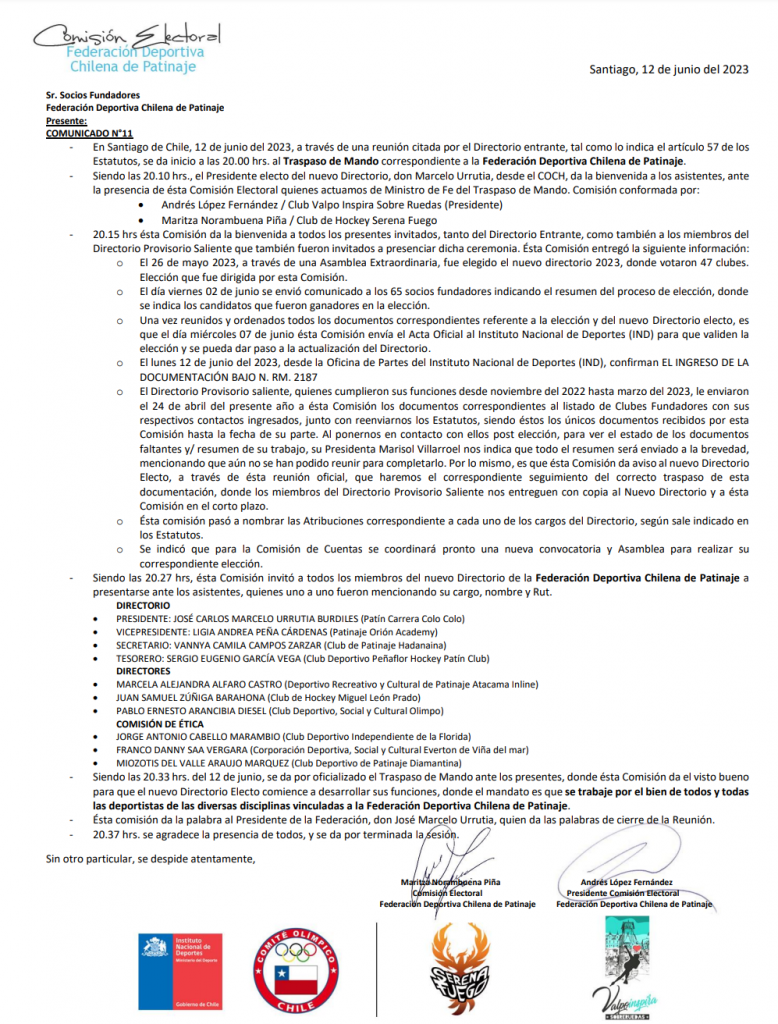 En dependencias del Comité Olímpico se realizó este lunes el traspaso de mando de los destinos de la Federación Deportiva Chilena de Patinaje al directorio electo en los comicios realizados el pasado 26 de mayo.